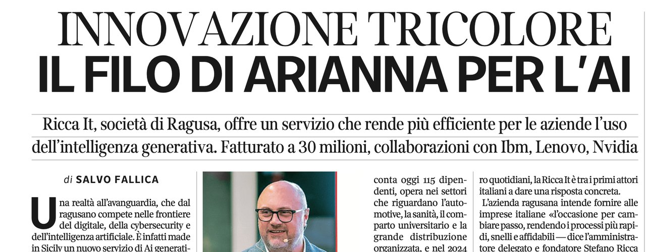“Una realtà all’avanguardia, che dal ragusano compete nelle frontiere del digitale, delle cybersecurity e dell’intelligenza artificiale. È infatti made in Sicily un nuovo servizio di Ai generati-va «corporate», denominato Arianna, progettato per poter trasformare il modo in cui le aziende gestiscono i dati e i processi e capace di adattarsi «su misura» a infrastrutture e programmi aziendali. È stato lanciato sul mercato da Ricca IT, azienda hi tech che ha il suo quartier generale a Ragusa e una serie di filiali e squadre operative attive su tutta la Penisola: la società ha infatti consolidato la propria posizione sul mercato nazionale aprendo sedi operative a Catania, Bari, Napoli e Roma”.